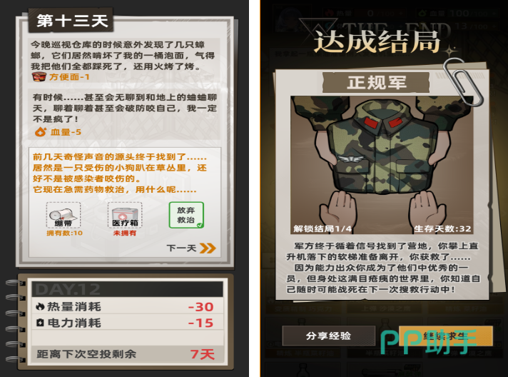 这是一款非常随机的末日生存手游,会按照日期为单位进行活动的选择与规划,玩家能到商店、住宅区寻找遗漏的物资,不过在探索的时候要小心,因为有可能会触发各种DEBUFF事件,在基地内需要准备好各类药品,因为如果受伤不及时治疗最后就会触发BE结局。游戏内随机事件多样,比如幸存者、受伤小动物求助,如果救治成功还有可能得到帮手和玩伴,还有可能救助失败最后使自己受到攻击,每一种选择都会有意想不到的结果。