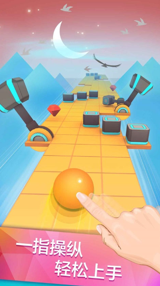 游戏的操控对象是球体,大家在操控球的时候,视觉效果很突出。在关卡里可以高速的滚动,关卡场景的样式非常多,有高低起伏的山地,还有浪漫的星空。每一个关卡里都会出现很多陷阱和一些突然出现的障碍,没有任何预兆,只要球体撞到这些陷阱或者是障碍,这一局就失败了,大家的反应速度和提前预知判断的能力一定要快才可以,这样才可以让大家全身心的投入进去,体验充满挑战的过程。