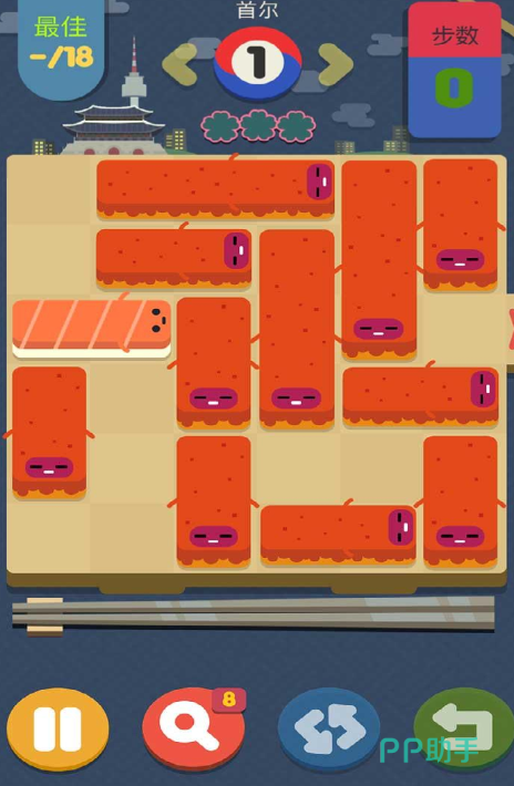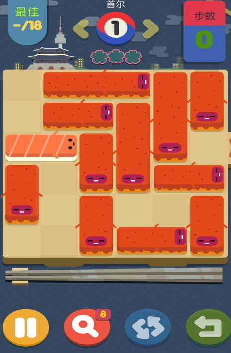 游戏把经典的华容道玩法作为核心框架,又融入了趣味十足的寿司主题。既能带来休闲乐趣,还能很好的锻炼玩家的思维能力,玩家的目标是通过巧妙操作,把目标寿司成功送出料理案板。游戏采用关卡制设计,打造了上千道难度各有不同的华容道谜题,每一个关卡中,玩家需要用最少的移动步数,把寿司顺利推到指定出口。游戏还给玩家准备了多种实用道具,一旦遇到难题,使用道具就可以获得操作指引。