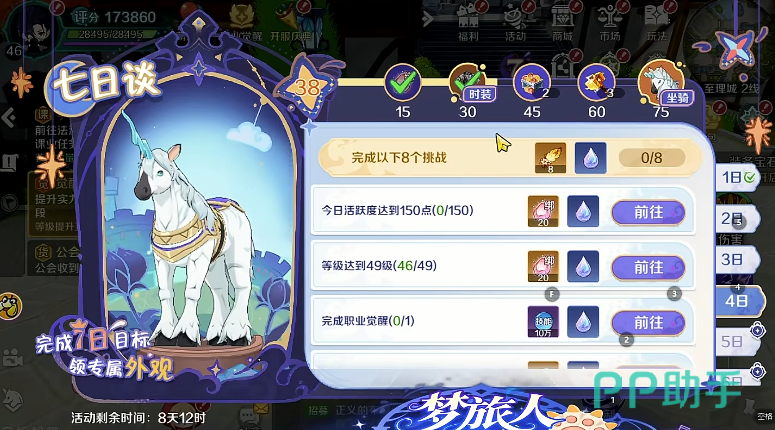 其次就是上线第一天,系统就会送给大家一张福利周卡,让大家轻轻松松在前期上线之后领到绑定的金钻以及大量材料,拿到这些材料之后大家就可以看到骑士团任务,这个任务其实不用大家刻意的去做,每天上线之后,随着日常以及挑战的各种活动玩法就可以轻松完成,虽然任务简单但是给的奖励可不简单,不管是红品铭文宝箱,还是可以用来给使魔锻造装备的超级锻造锤都是可以拿到的,后期很多玩家都想要的完美侍者的时装都会在这里获取,而且玩家的积分达到75之后还会给到大家一个坐骑,也就是独角兽。