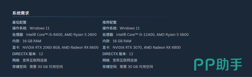 在硬件层面,本作对图形处理能力提出显著更高要求。官方明确标注:最低显卡需为NVIDIA GeForce RTX 2060(显存8GB),该配置仅可保障基础运行,但多数高级光追效果、环境粒子及动态阴影将被自动关闭;若要完整呈现UE5引擎所支持的Nanite几何体与Lumen全局光照系统,则推荐使用RTX 3070或同级显卡。处理器方面,最低要求为Intel Core i5-8400,推荐配置提升至i5-12400;考虑到多线程任务调度与AI行为计算负载,实际体验中i7系列CPU将明显改善帧生成稳定性。内存方面,16GB为强制下限,建议搭配双通道DDR4 3200MHz及以上规格。操作系统方面需特别注意:游戏仅兼容Windows 11(22H2及以上版本),不支持Windows 10及更早系统。存储空间需求为30GB可用硬盘容量(不含更新包与缓存文件)。