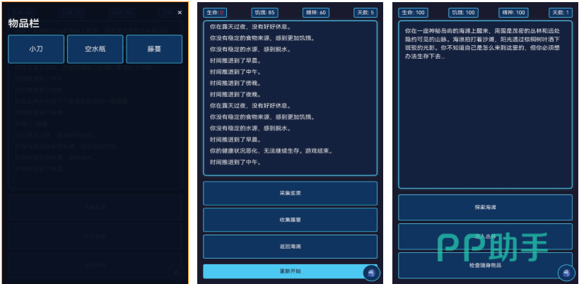 岛屿生存游戏爱好者可以进入文字叙述的神秘岛上求生,这款文字互动的解谜生存游戏有着沉浸式气氛刻画,玩家有机会进入文字呈现的岛屿中与各种道具交互,生存与解谜元素融合的游戏理念深入人心,可以自由选择文字对话跟虚拟的NPC完成交互,各类随机出现的突发事件让岛屿生存游戏爱好者心驰神往,文字游戏也可给玩家带来沉浸式求生体验哟。