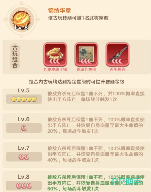 该古玩提供单场战斗限定一次的「濒死反制」机制:当佩戴者被敌方击杀时,强制保留1点生命值,且攻击方立即阵亡;同时,佩戴者生命值恢复至60%最大值。此效果不可叠加,每场战斗仅触发一次。