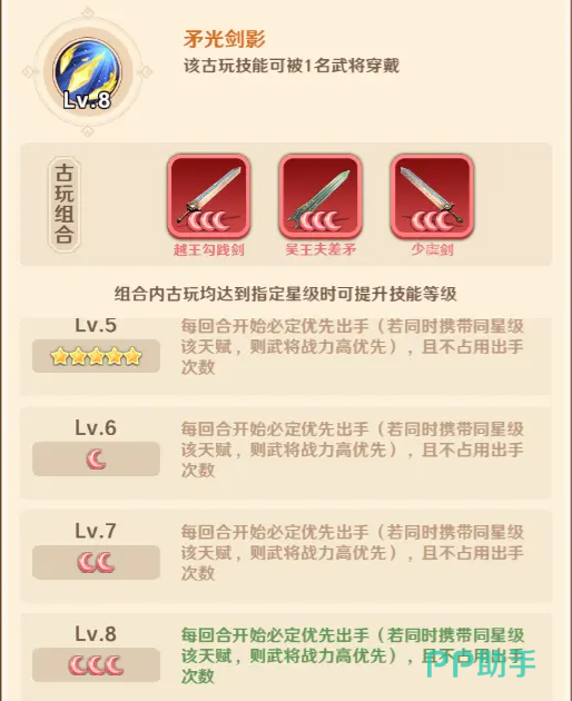 该古玩核心机制为「每回合必定率先行动」。当敌我双方均装备同星级矛光剑影时,触发判定依据为武将战力数值,战力高者获得绝对先手权。此特性对依赖首回合释放关键技能的武将具有战略意义:例如怒气获取型辅助、增益叠加型指挥者,或需抢先施加眩晕、沉默等控制效果的战术核心。合理配置可有效压缩对手反应窗口,构建开局压制优势。