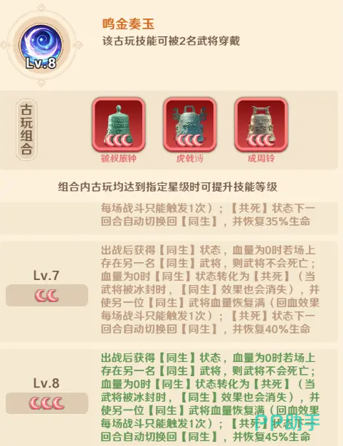 装备后,武将登场即获得「同生」状态。当其生命值归零时,若场上存在另一名同样处于「同生」状态的友方单位,则立即触发联动机制:当前角色不会阵亡,转为「共死」状态;同时,另一名「同生」单位生命值瞬间恢复至满值,并在下一回合开始时额外恢复45%最大生命值。