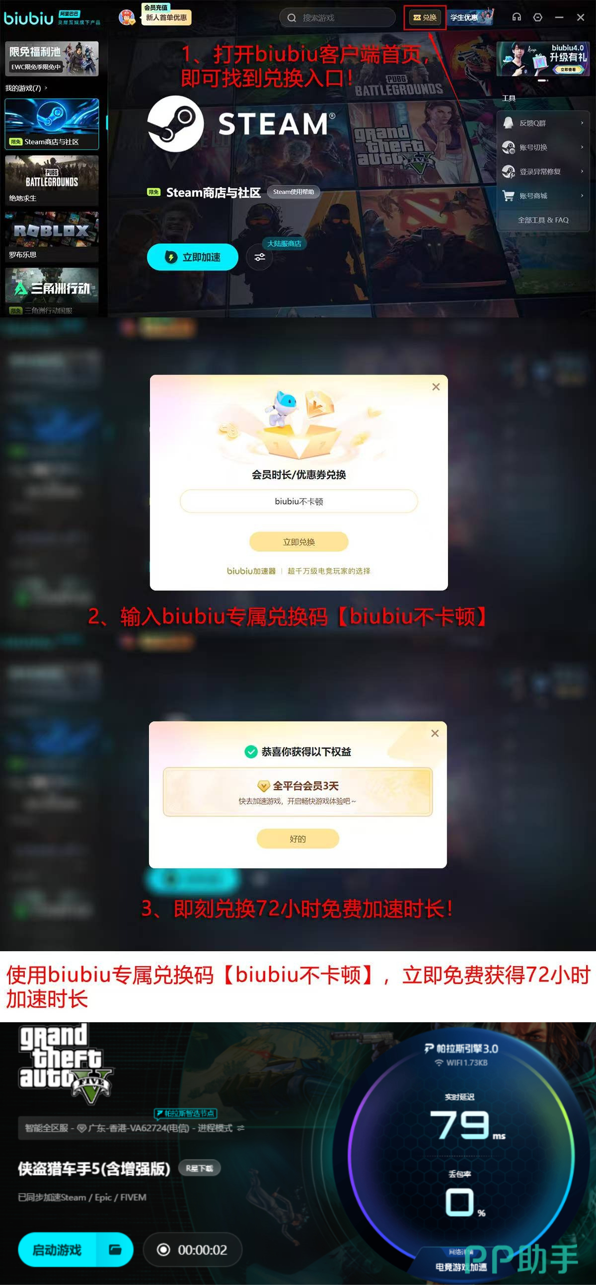 新版biubiu在加速响应效率、协议兼容性及系统资源占用率等方面实现综合跃升。为便于用户真实验证效果,官方推出限时体验计划:新注册用户可立即获得24小时无限制零卡顿加速权限;输入专属口令【biubiu不卡顿】,还可额外激活72小时连续使用权,累计享96小时完整线上模式体验周期。这一安排旨在帮助玩家在真实游戏节奏中评估其应对洛圣都复杂网络环境的能力。