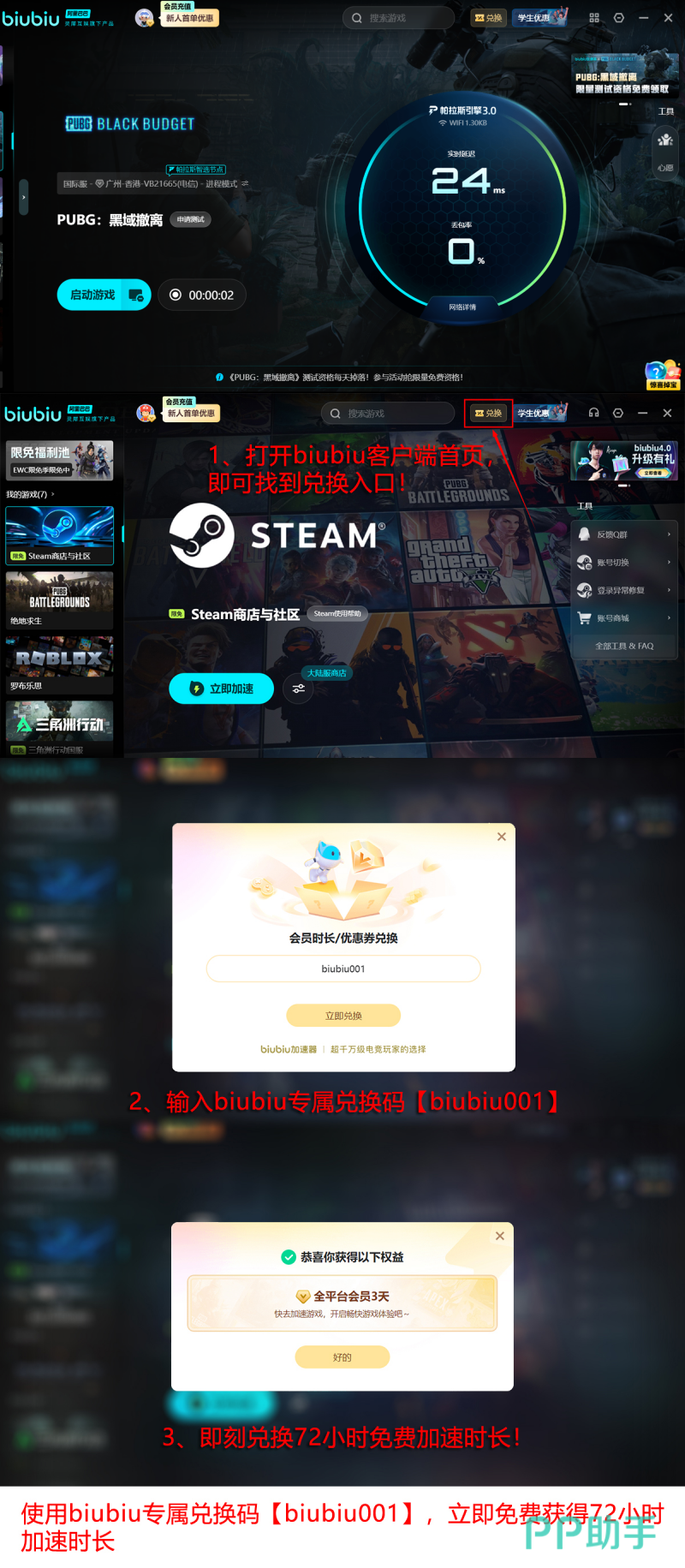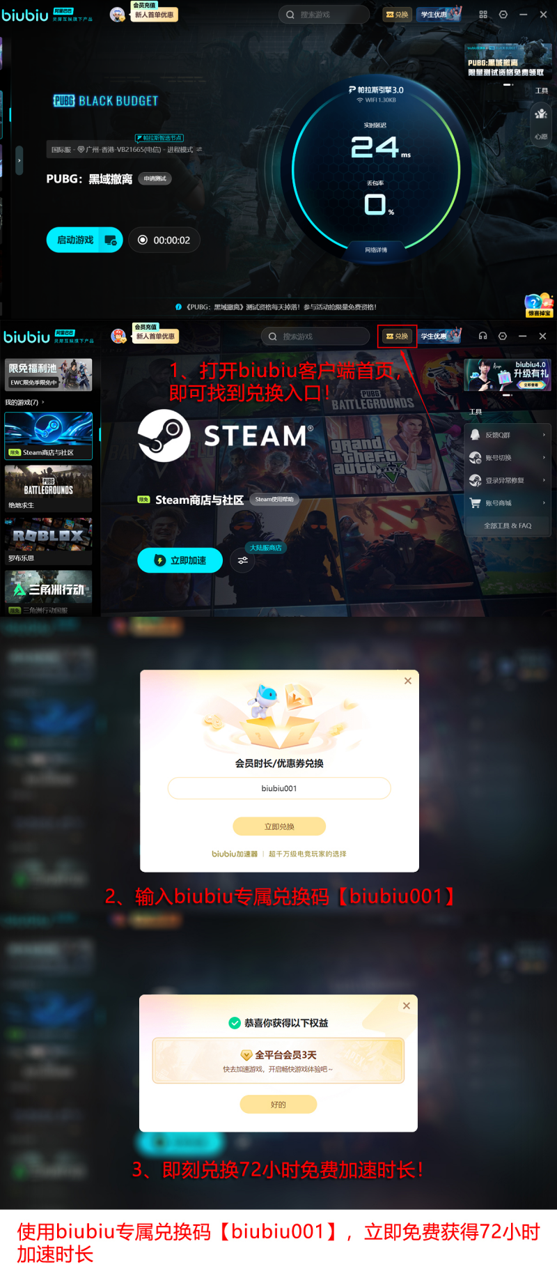 其最新版本集成帕拉斯引擎3.0系统,支持毫秒级网络状态感知与动态路由切换。实测数据显示,启用加速后,地图加载耗时平均缩短约35%,撤离阶段操作延迟下降超40%,关键指令(如开火、投掷、拾取)与画面反馈基本实现零感知偏差。值得关注的是,PUBG世界冠军XDD担任该产品体验官,全程参与黑域撤离专项调优,针对战术决策密集、节奏紧凑的玩法特性进行了深度适配。新用户注册即可获得24小时免费加速时长,输入兑换码【biubiu001】还可额外叠加72小时,总计享有96小时全平台加速权限。