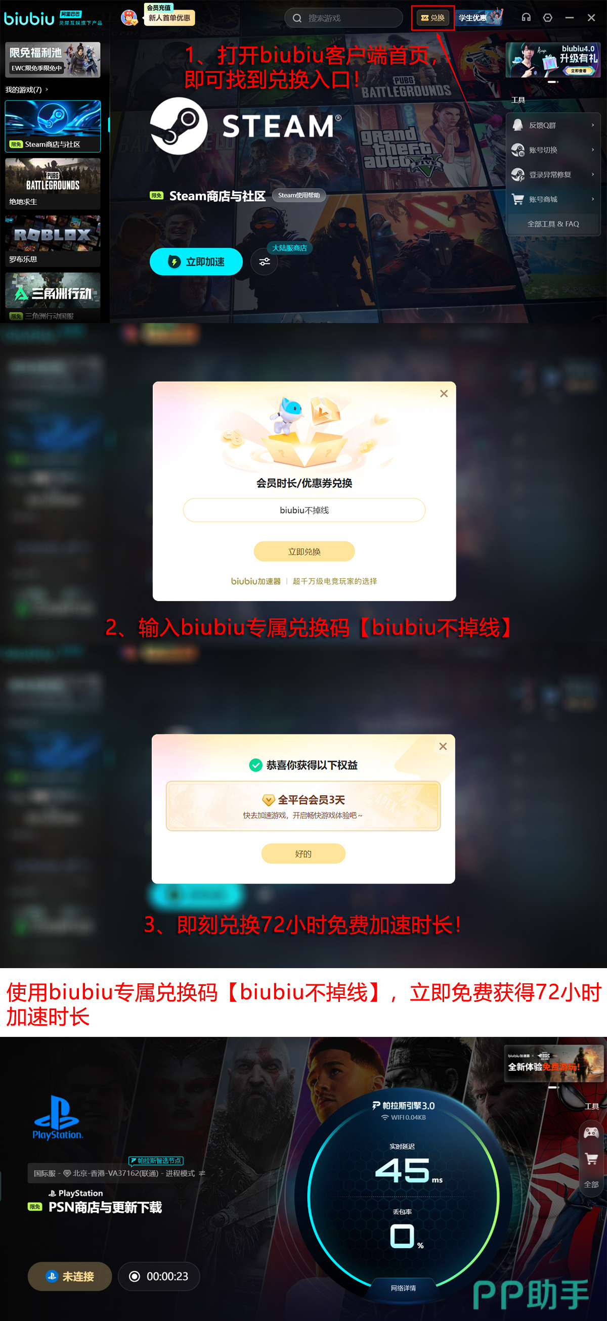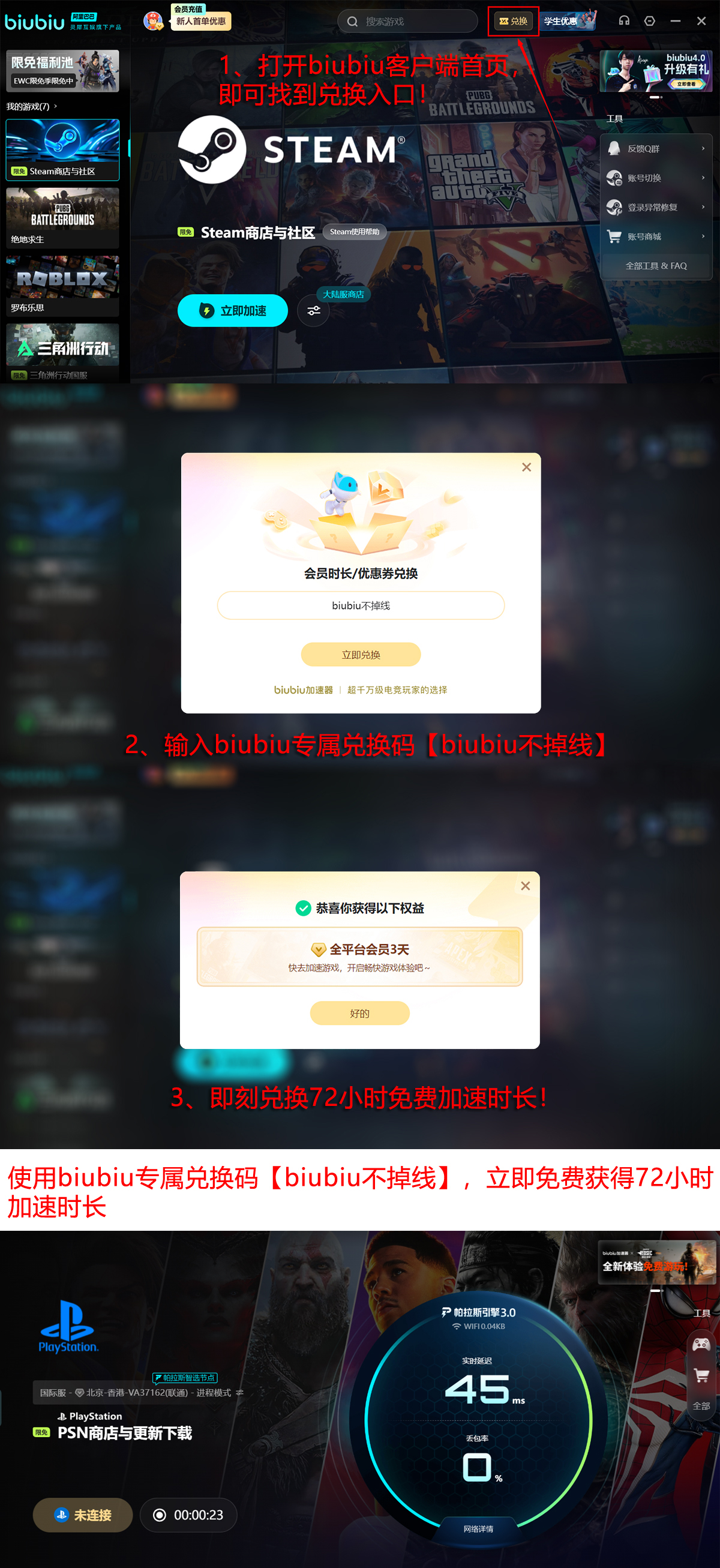 新用户注册后,输入专属激活码【biubiu不掉线】即可领取72小时高级加速权限;首次完成账号绑定还可额外获赠24小时会员时长。两项权益叠加后,总计可享受96小时无限制加速服务。