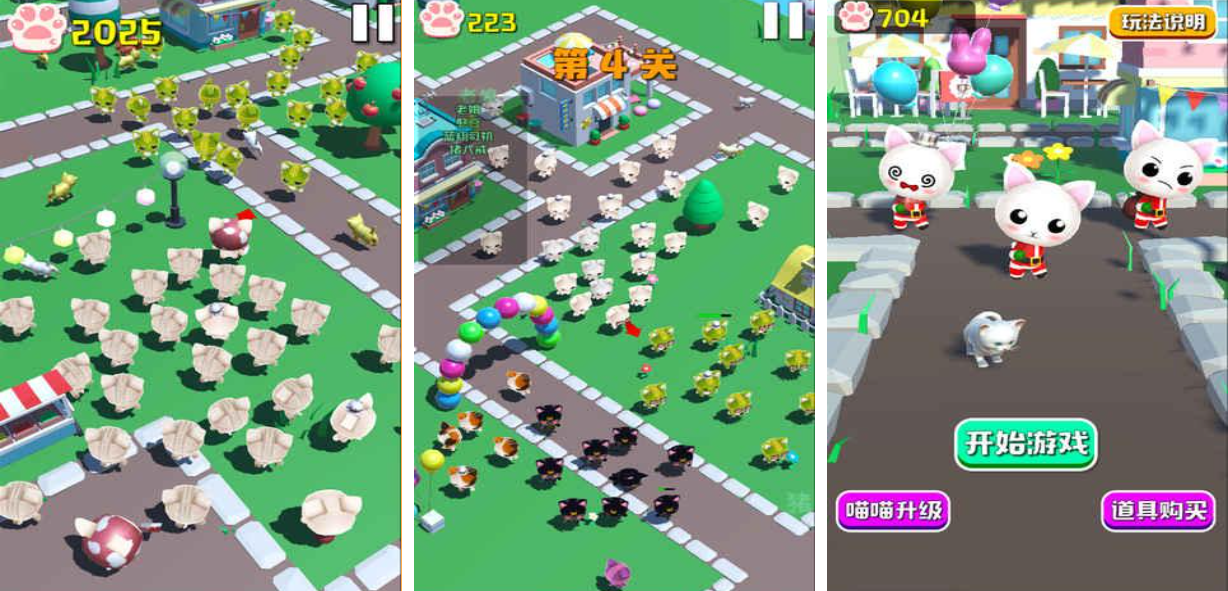 这是一款基于城市开放地图的策略吞噬类手游。开局选择初始猫种后,玩家需操控猫群在立体化都市环境中游走扩张,通过接触同化其他AI控制的猫咪单位实现规模增长。系统支持多层级编队管理、动态路径规划及外观定制模块,包含毛色更换、配饰装配与属性加成等成长维度。地图细节丰富,涵盖街道、天桥、广场、商场等典型城市空间结构,增强探索真实感。