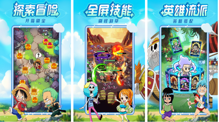 本作主打竖屏轻量化卡牌体验,融合放置挂机与主动微操双模式。寻宝系统采用六宫格随机事件机制,果实养成包含基础属性加成、被动技能激活、形态进阶三阶段,其中动物系果实可解锁兽型/人兽型/完全兽型三种战斗形态。全屏杀技能触发需消耗满格怒气,不同流派(如霸气流、果实流、团队增益流)拥有独立天赋树,英雄数量达127名,覆盖动画至最新连载章节全部主要战力单位。