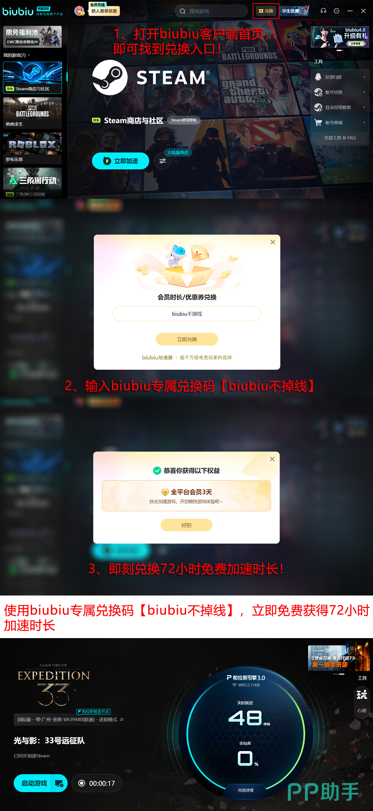 特别提示:即日起至2025年12月25日,biubiu加速器开放《光与影:33号远征队》专属限免加速服务;新用户注册即可获得24小时基础加速时长;参与兑换活动并使用口令【biubiu不掉线】,还可额外获取72小时服务,累计享有96小时加速权益。