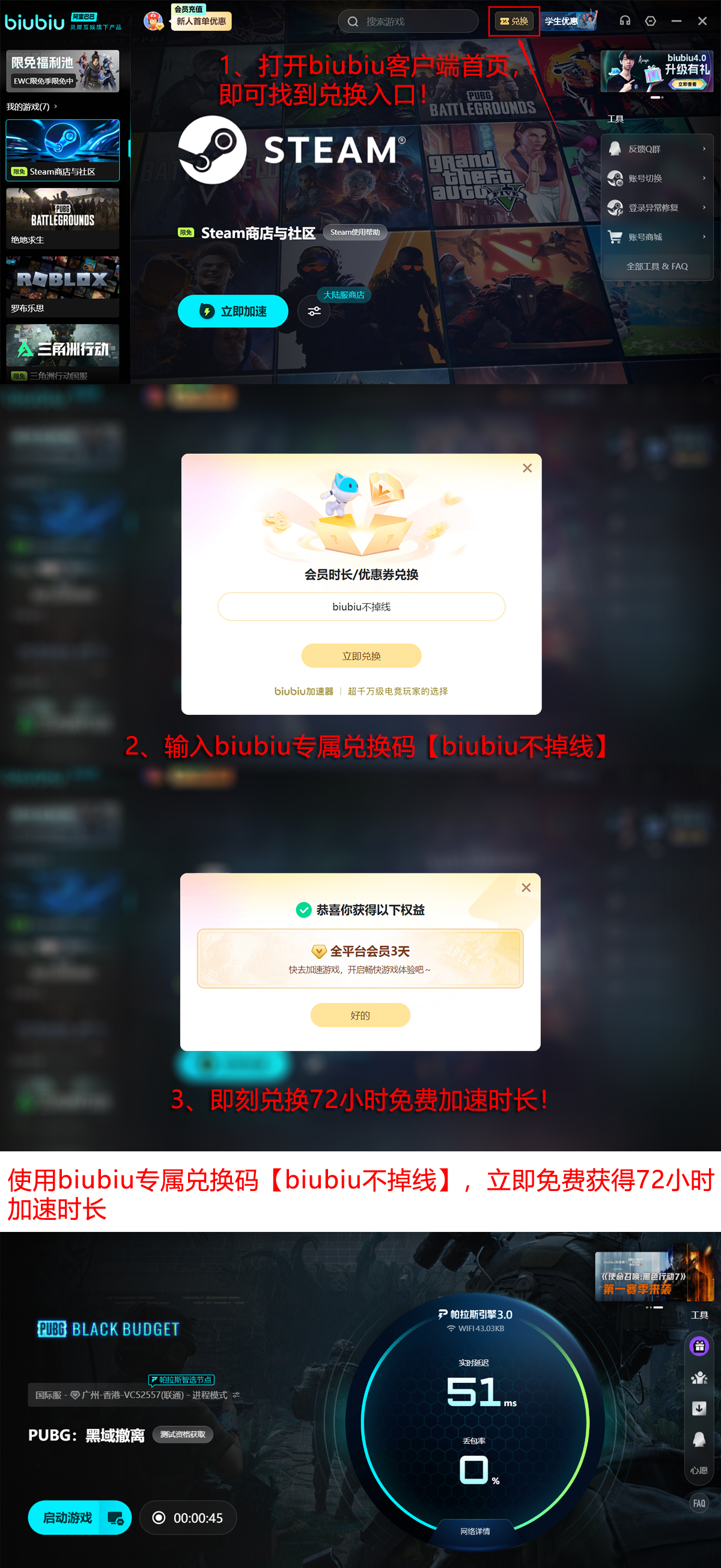 新用户注册即可获得24小时免费试用权限。输入专属密钥【biubiu不掉线】,可额外激活72小时连续服务时长,累计享4天无限制加速体验。此外,官方定期开放测试资格申领活动,完成指定任务即有机会抽取限量加速时长,每日均有名额释放。