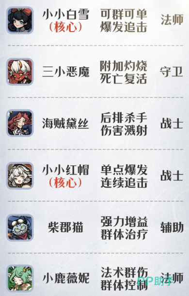 三小恶魔这个角色的话,他作为守卫类型的角色自身可以附加一定的灼烧效果,而且他有一个非常独特的能力,就是如果队伍当中有角色死亡的话,那么他的一个复活机制就可以得到足够的生存能力,特别是针对于他自己的话,相当于就是拥有了另外一层生命条,所以放在这里的话,也可以保证阵容当中小小白雪的生存核心,下面如果大家还想要觉得输出不太够的话,还可以给他们增加一个小小红帽,这个角色她放在游戏当中的话,也是阵容里面的核心战士类型角色,主要是依靠她的单点爆发进行一个单体的补充伤害。