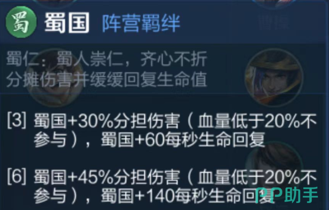 蜀国羁绊聚焦团队续航与承伤优化:当场上存在3名蜀国角色时,全体蜀国单位每秒恢复235点生命值;6名蜀国角色可使全体蜀国单位将所受伤害的45%分摊至其他蜀国队友;若9名上场角色均为蜀国,则伤害分摊比例提升至60%,并维持每秒235点的生命回复效果。