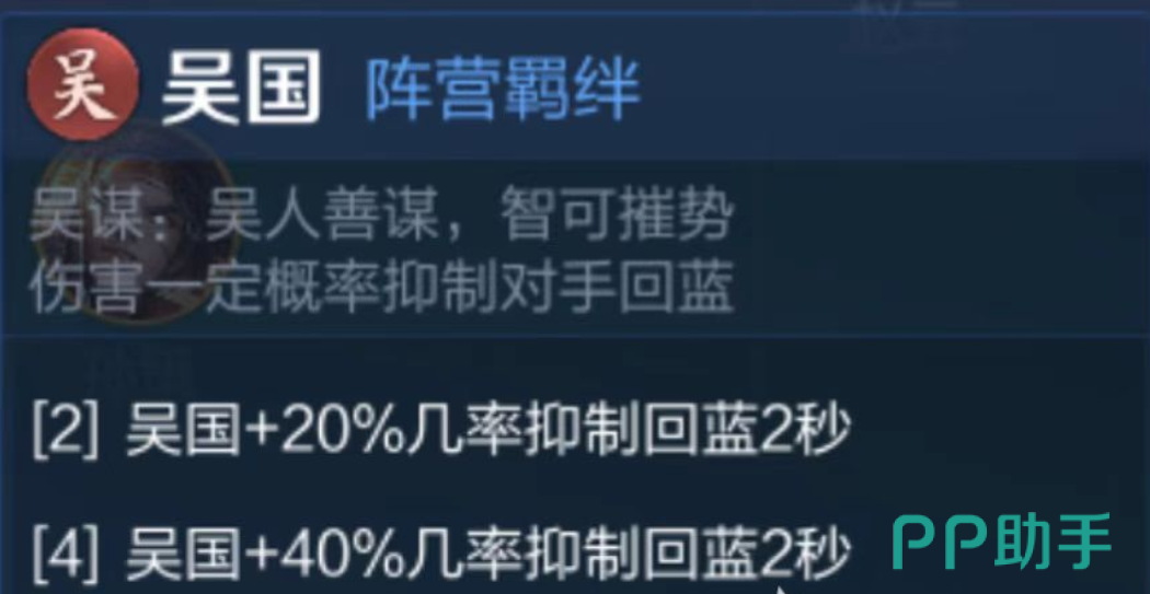 吴国羁绊主打战术压制,专精于限制敌方技能循环:2名吴国角色可使敌方单位有20%概率在2秒内无法恢复法力值;4名吴国角色将该抑制概率提升至40%;当6名吴国角色全部在场时,抑制概率达到75%,持续时间同步延长至2.5秒。该效果虽不显眼,但在关键技能真空期可有效打断敌方核心操作链。