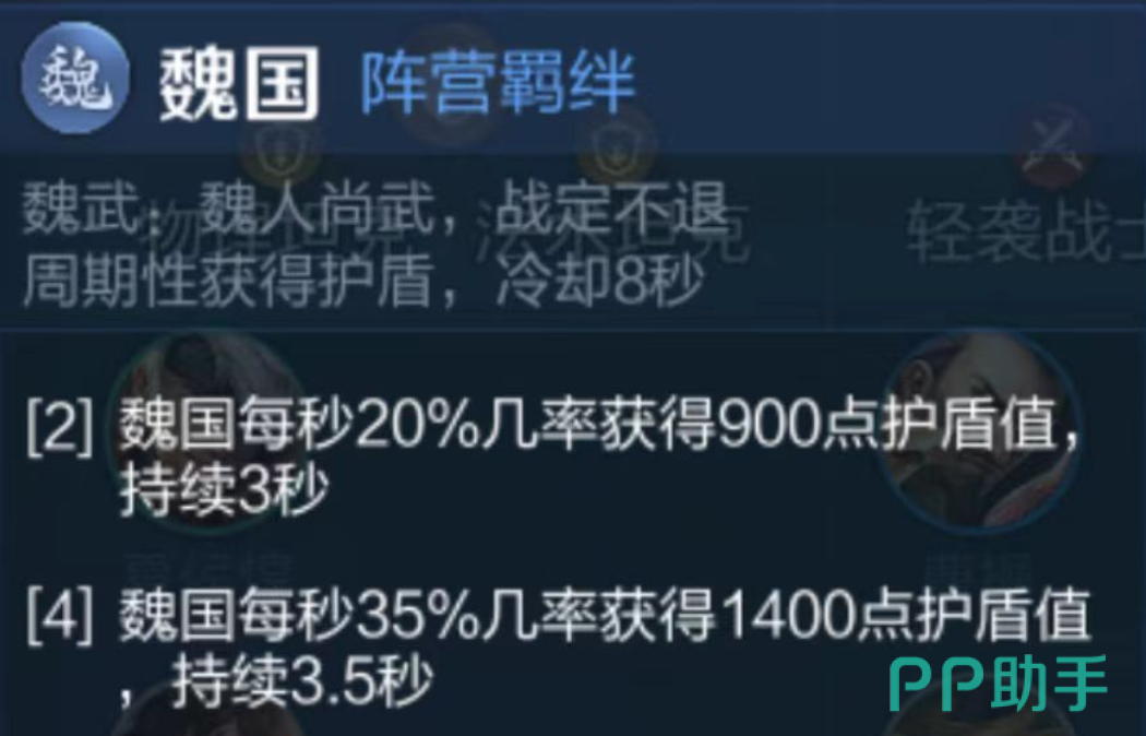 魏国羁绊侧重防御强化,通过概率性护盾生成提升容错率:2名魏国角色在场时,每秒有20%几率为一名魏国单位附加900点护盾;4名魏国角色时,触发概率升至35%,护盾量达1400点;6名魏国角色则可实现50%触发概率,单次护盾值高达3000点。