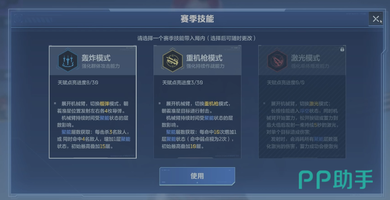 第三类为【激光模式】:机械臂转为高能激光发射装置,长按技能键可触发浮空状态,在滞空期间仍可进行聚能并释放穿透性激光攻击。该模式操作逻辑清晰、启动门槛低、机动容错空间大,新手玩家可快速建立操作信心,是入门阶段最稳妥的赛季技能配置方案。