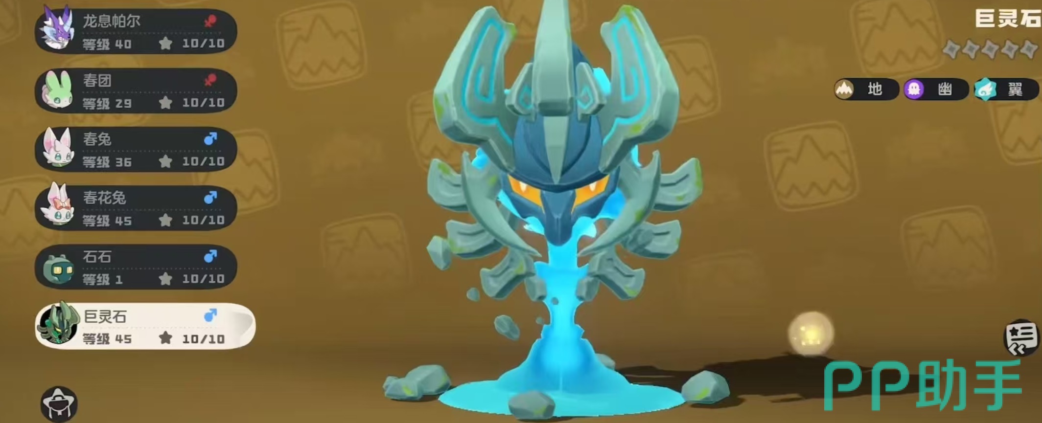 针对不同输出体系,推荐两套差异化技能组合方案。若采用物理流打法,可配置“重击”“岩土暴击”“地震”与“幻象”:其中“重击”单次耗能低且伤害稳定,“岩土暴击”在受击后自动降低下次使用能耗,配合“地震”的AOE爆发与“幻象”的节能补刀,形成高效循环输出链。若倾向特攻路线,则推荐“陨石”“幽灵爆发”“背袭”及“泥巴喷射”组合:“背袭”基础伤害极高,且当对手能量为零时伤害翻倍,与其他技能联动可迅速压低敌方血线。在队伍协同层面,巨灵石擅长消耗与压制,与狮鹫、翼龙等飞行系精灵存在天然配合优势——前者承担控场与减能任务,后者伺机收割残血目标,实现战术分工明确、节奏衔接流畅的协同作战体系。