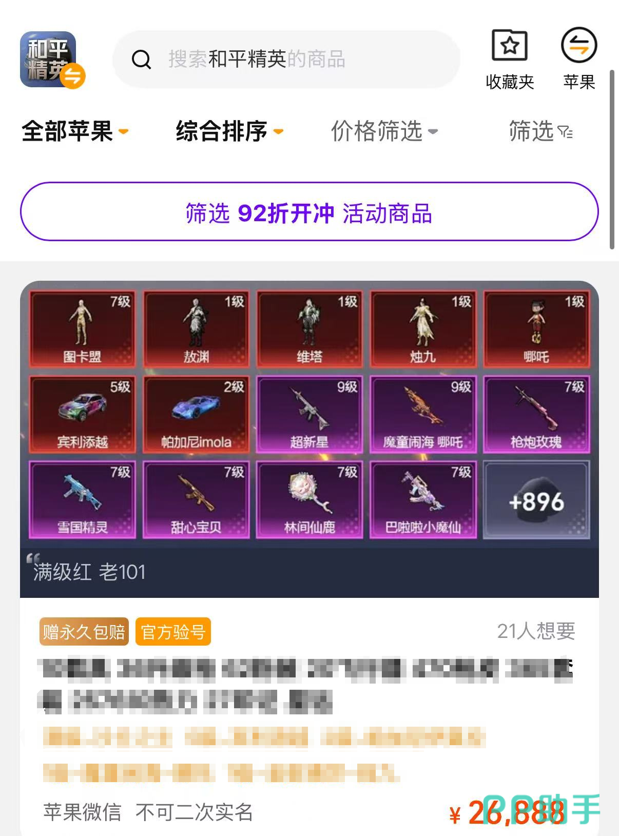 平台内《和平精英》账号资源丰富,涵盖不同等级段位(如王牌、无敌战神)、不同外观配置(含玛莎拉蒂主题服饰、五爪金龙系列皮肤)、不同成长阶段(新手起步号、满配战神号)。为提升筛选效率,平台设立专属“和平精英交易专区”,支持按价格区间、段位、皮肤数量、是否实名等条件精准过滤。当前正开展限时优惠活动,部分商品享92折特惠,用户可在活动标签下快速定位高性价比账号,即买即用,快速融入高端局氛围。
