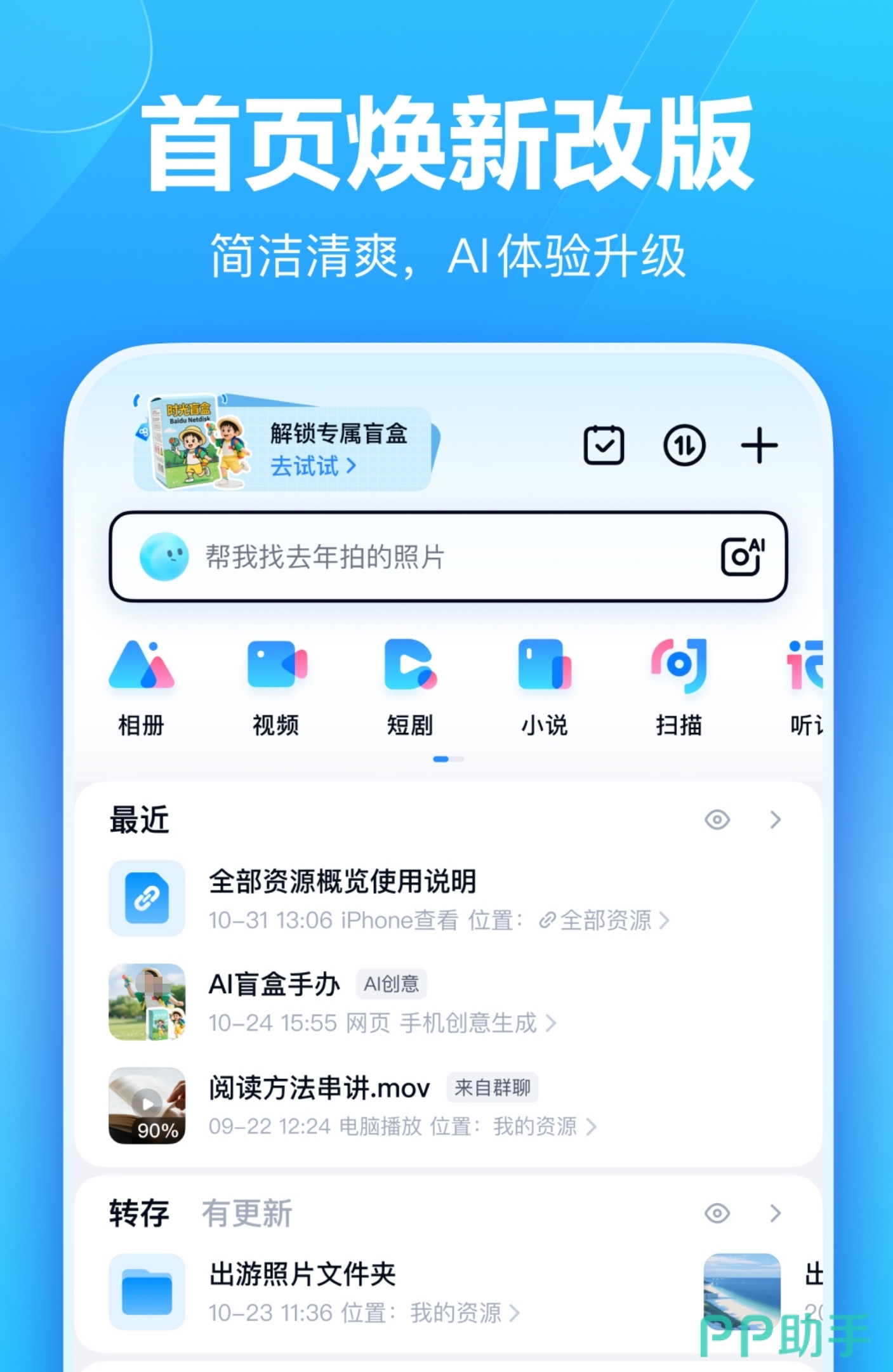 百度网盘已从传统云存储工具演进为AI驱动的智能工作中枢。其内置的AI相机支持拍摄即优化、自动裁边与高清增强;AI笔记可解析手写稿、PPT截图及PDF讲义,生成带标题层级与关键词标记的学习摘要;简单听记则能将会议录音实时转写为结构化文本,支持重点语句高亮与发言角色区分,满足多场景知识沉淀需求。