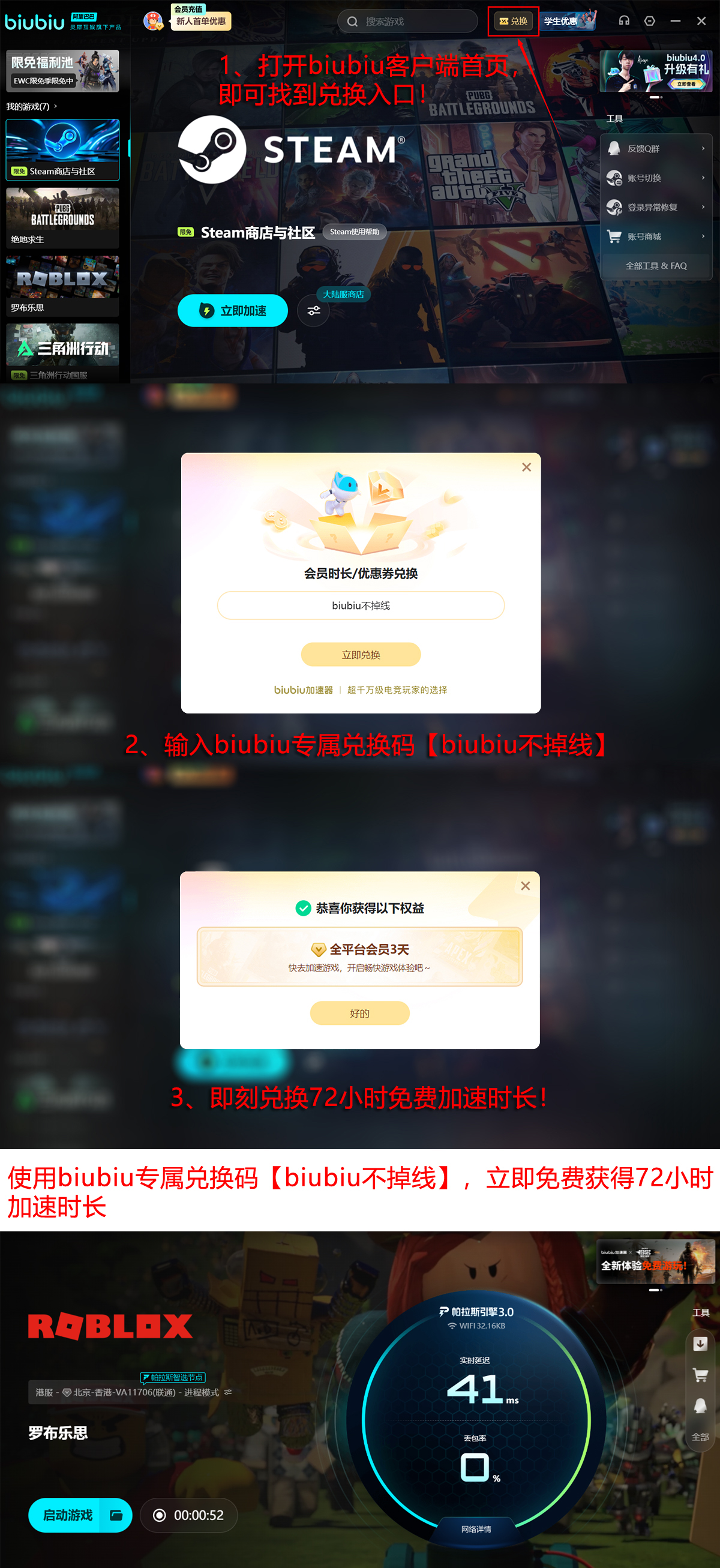 新用户注册后即可领取24小时免费加速时长,用于全面体验罗布乐思全模式运行效果。输入专属口令【biubiu不掉线】,还可额外解锁72小时深度加速权益;新老权益叠加后,总计可享96小时无限制加速服务,覆盖新手引导、创作协作、竞技对战等全部使用场景。