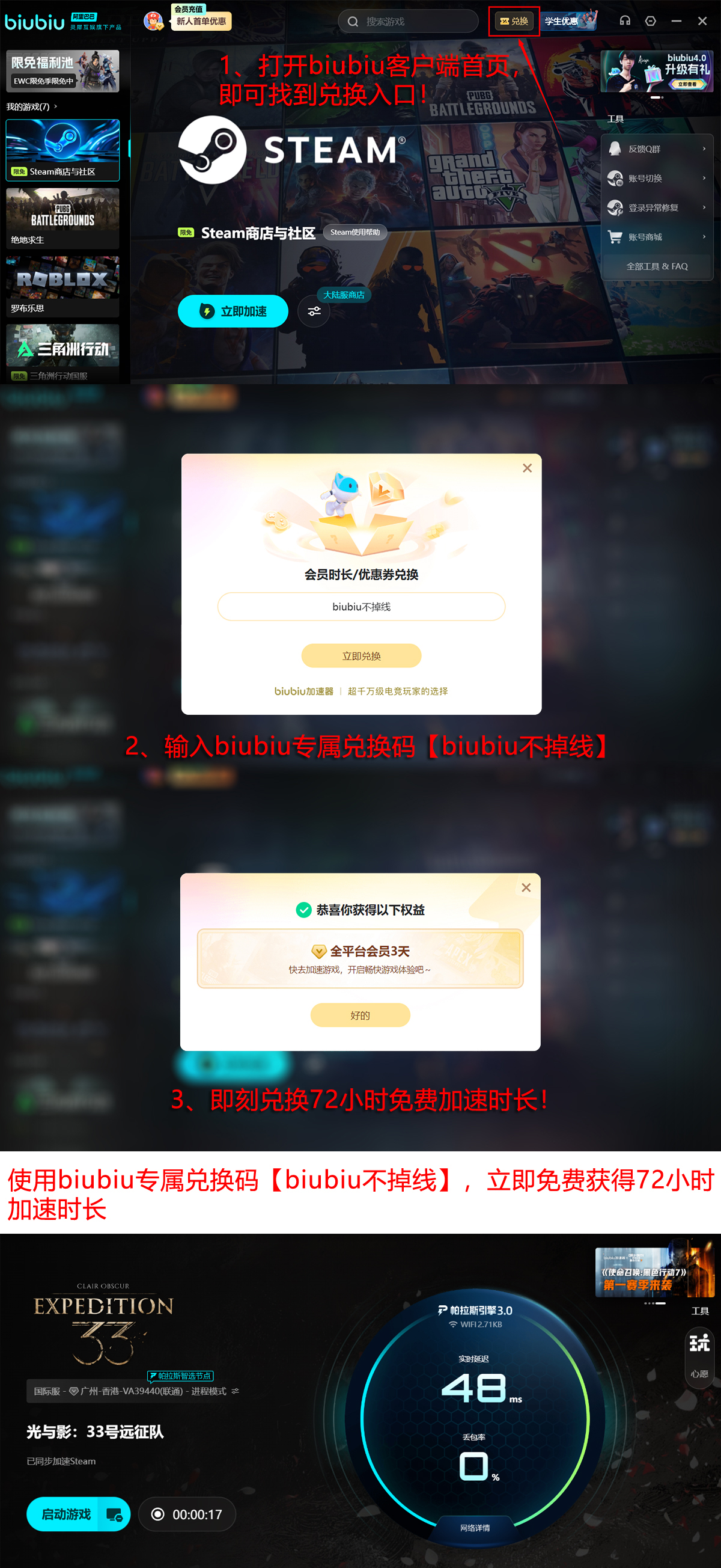 即日起至12月25日,biubiu加速器面向《光与影:33号远征队》推出限时免费加速服务;新用户注册即可领取新手礼包,并享有24小时基础加速权益;输入专属密钥【biubiu不掉线】,还可额外激活72小时高级服务权限,总计可获得96小时连续加速支持。