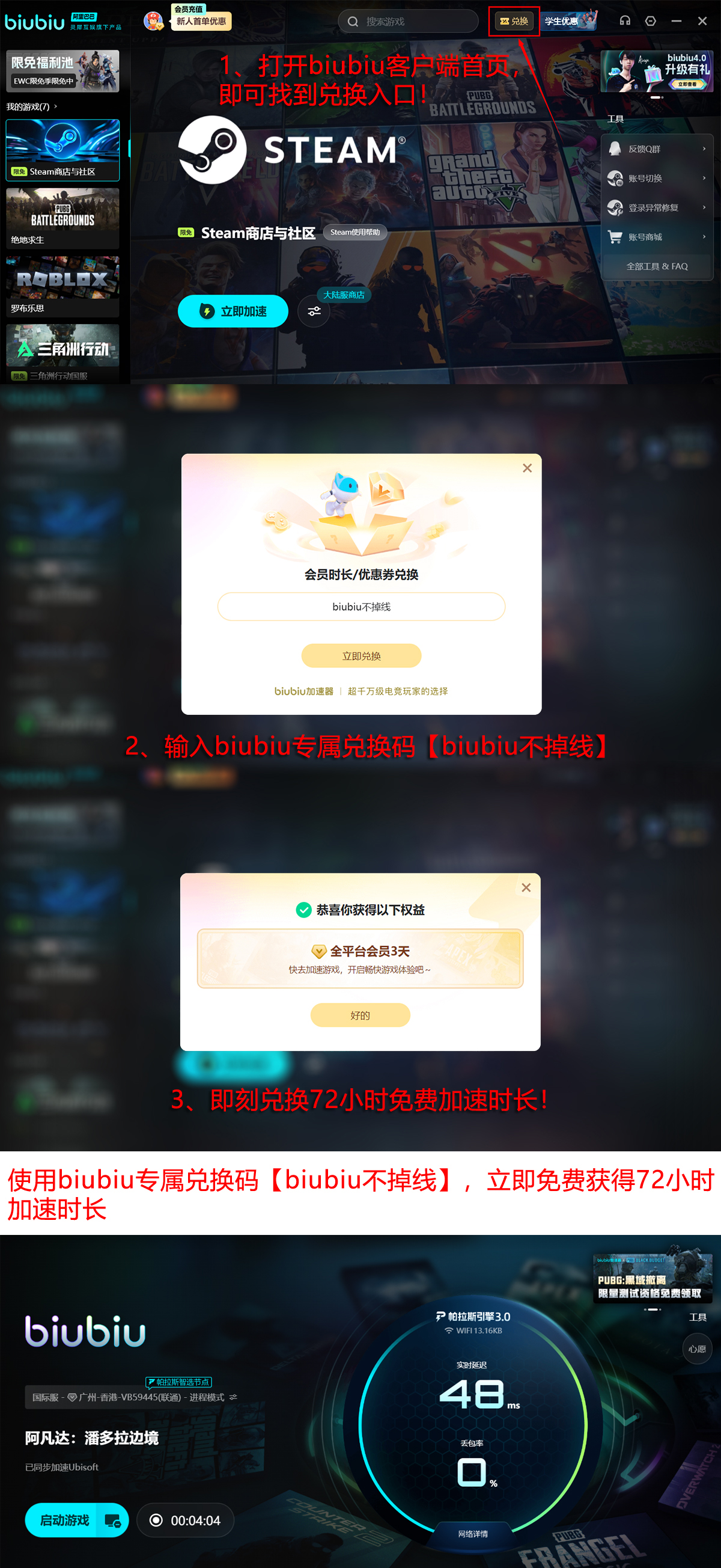 新用户注册即可领取通用福利密钥【biubiu不掉线】,激活后享72小时连续加速服务;首登用户额外获赠24小时,累计可达96小时有效使用时长。