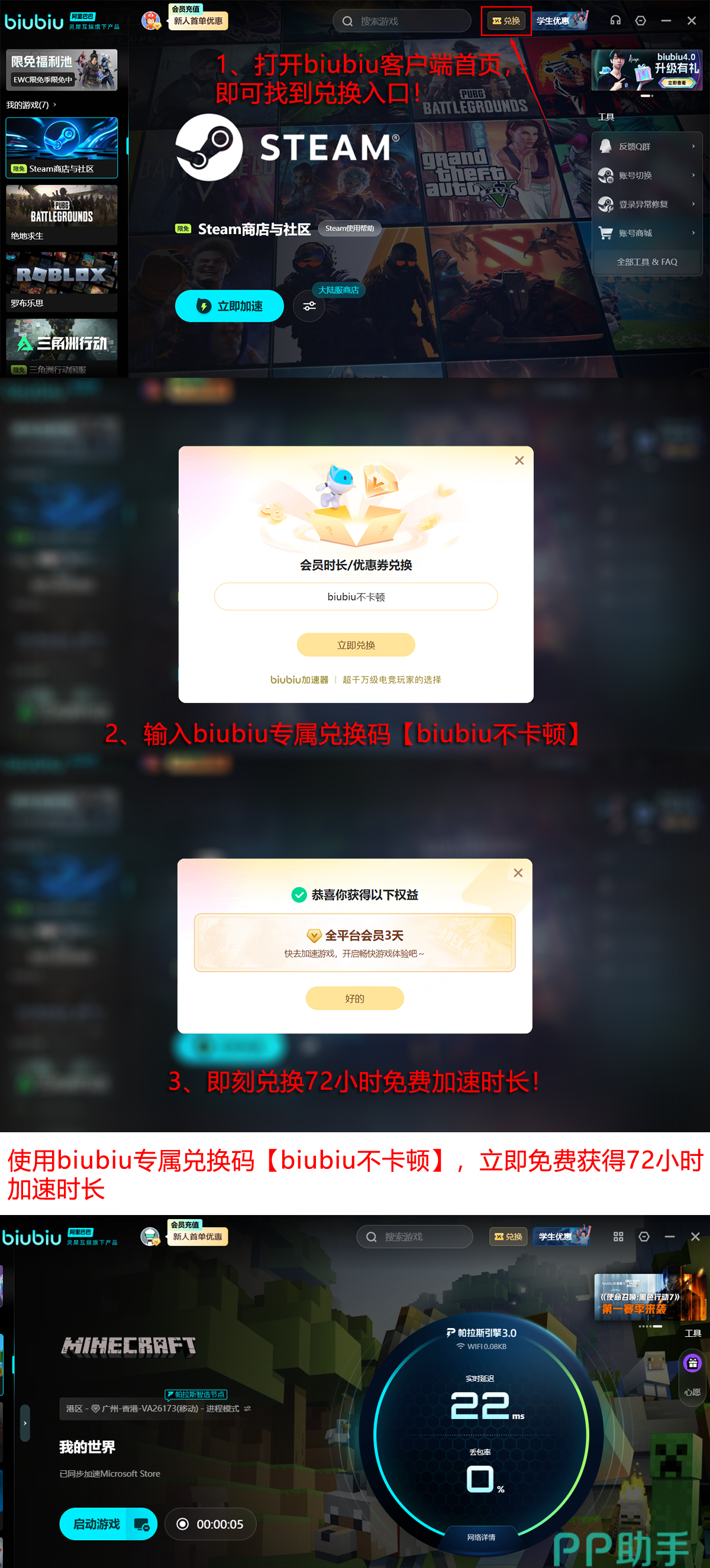 不过部分玩家还未体验过这种加速效果,新人注册后可立即获得24H的免费加速,可以先开一场对局试试,就会发现它的加速魅力了!若是还想多玩几天的话,新老用户都可以输入一次兑换码【biubiu不卡顿】,就能领取三天免费加速!可以多陪自己的队友们,继续参加全新的关卡对局!