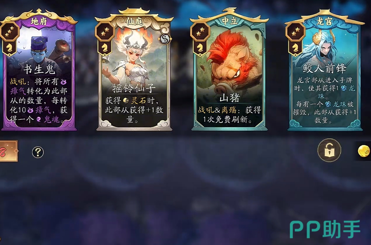 对将开启后,各位可先用杂役弟子和其它的一星部从过渡,慢慢拿到摇铃仙子和胖道士,由于白卦流的核心卡有三张星级较低,且杂役弟子可在白卦部从入场时为玩家提供灵石,摇铃仙子和胖道士都能通过获得灵石来叠加部从数量,所以此阵容从前期开始就能产生灵石收益,且部从数量也会叠加得比较高,在高星的地仙和紫府老君出来前能很好地顶住前期的压力,同时还能让自己更快地完成对天书的升级,寻找后续所需要的部从。
