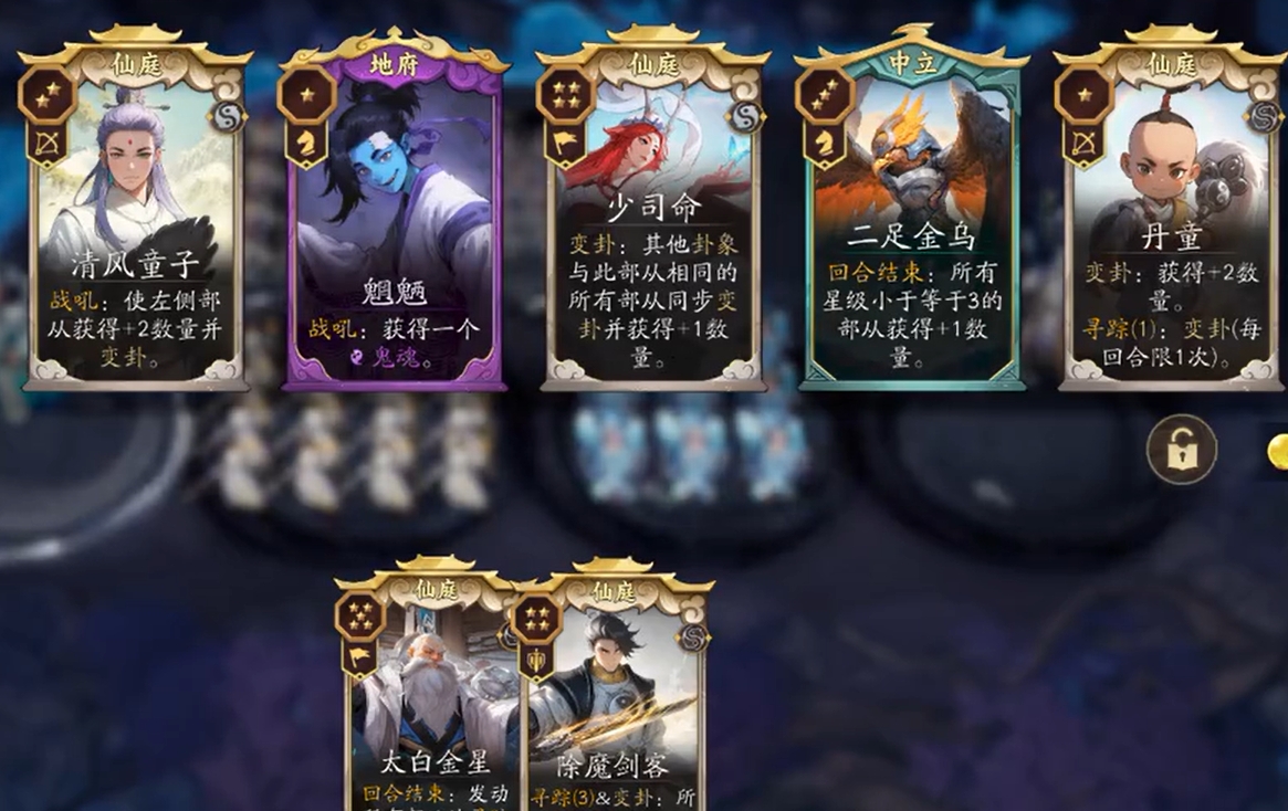 若说白卦流是以白卦部从为核心的阵容组合方案,那黑卦流自然是以黑卦部从为主,但同时也要用到仙庭独特的变卦能力,才能更好地实现部队数量的提升。该流派的核心卡为瑶池仙子、除魔剑客、救苦仙尊、太白金星、天罡星君,还有两个上阵位可根据需要随意搭配,只要利用好寻踪(通过刷新天书触发)和变卦的联动,来不断触发黑卦部从叠加数量的机制,以此来完成阵容的提升,有着极高的强度上限,成型后甚至可跨战力作战,所以用此流派的人也很多。