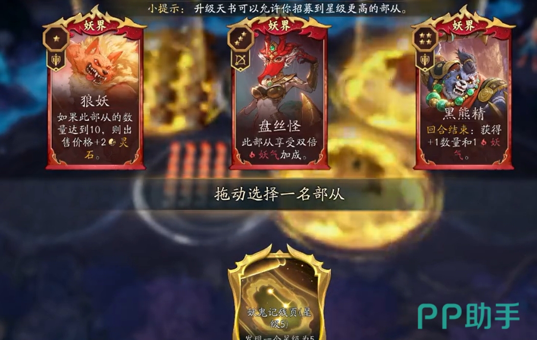 要想玩好妖族电表流,关键是要核心妖界奇市坊主,它可在发动战吼效果后获得一个妖界奇市宝箱,能开出各种妖族部从,配合上金翅大鹏可让玩家在妖族部从数量到10时获得1灵石的效果,以及青毛狮王能让所有妖族部从都具备战吼的特性,可令所有部从都通过战吼联动,使得玩家能在稳定运营下可一直进行天书刷新,再加上还有黄风怪战吼可确保天书刷新时全出妖族部从,令整个流派有着极佳的循环能力。最重要的是,六星狰妖可让所有具有战吼效果的部从立刻发动战吼效果,也令整个妖族电表流运转起来更为流畅。