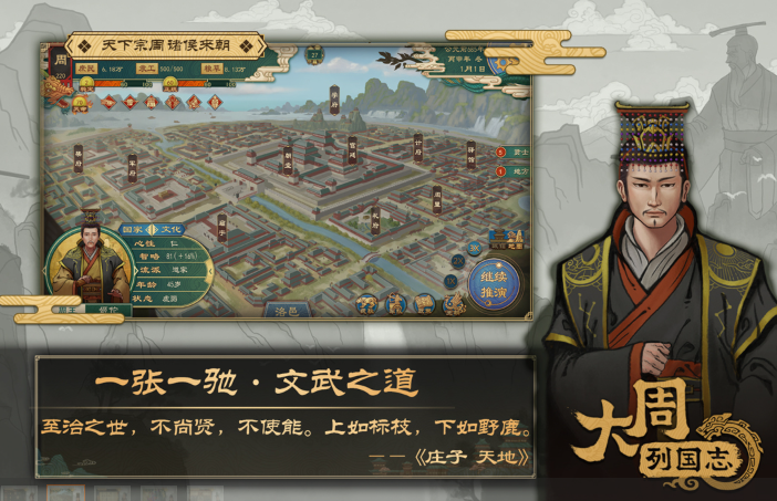 大周列国志的玩法围绕着诸侯发展和天下争霸进行展开,玩家作为一方诸侯,可以选择不同的方式来发展自己的势力,内政的管理上包含各种制度上的改革,进入国族阶段后可以推行州郡制或者郡县制等各种改革,军事系统上也支持组建进军队伍,势力发展到一定阶段,可以在都城中设立特殊的单位,提升进军的数量和战斗能力。