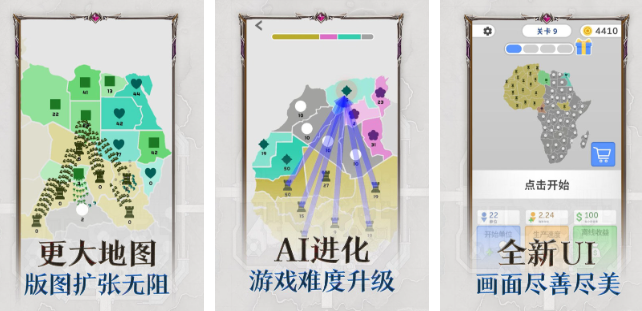 以帝国崛起和领土的征服为游戏战斗核心,玩家需要升级资源生产设施和各种城市中的建筑进行发展,根据发展的实际需求,可以选择侧重于农业或者工业的发展方式,军事系统中玩家还可以招募多种兵种进行组合的军队,通过实力的对比来制定进攻策略,并征服周边的领地。