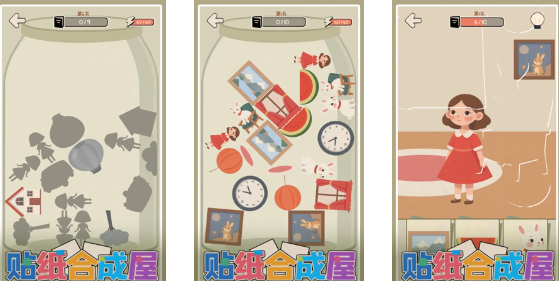 游戏设计了不少带着怀旧感的场景,不过这些场景刚解锁的时候,都会显得格外冷清。玩家需要做的是借助合成玩法,解锁各种贴纸,再把它们贴到场景中对应的位置,让原本单调的画面变得丰富起来。除此之外,玩家还能用贴纸给卡通角色变换装扮,整个游戏的上手难度不高,可以用来释放压力。