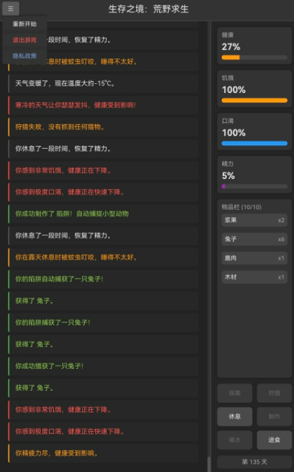 在游戏中,你会因飞机失事后被困荒野,要面对饥饿口渴和寒冷三重压力。大家可以在里面采集浆果蘑菇或者设陷阱抓兔子和鹿,制作滤水装置解决喝水问题,合成长矛篝火,搭建庇护所。这里面还有暴雪酸雨这些天气,不光好看,还会为你的身体状况带来威胁。这里面没有氪金也能成长,所有资源都靠自己获取,暗色系界面配合金属质感,营造出很好的求生氛围。