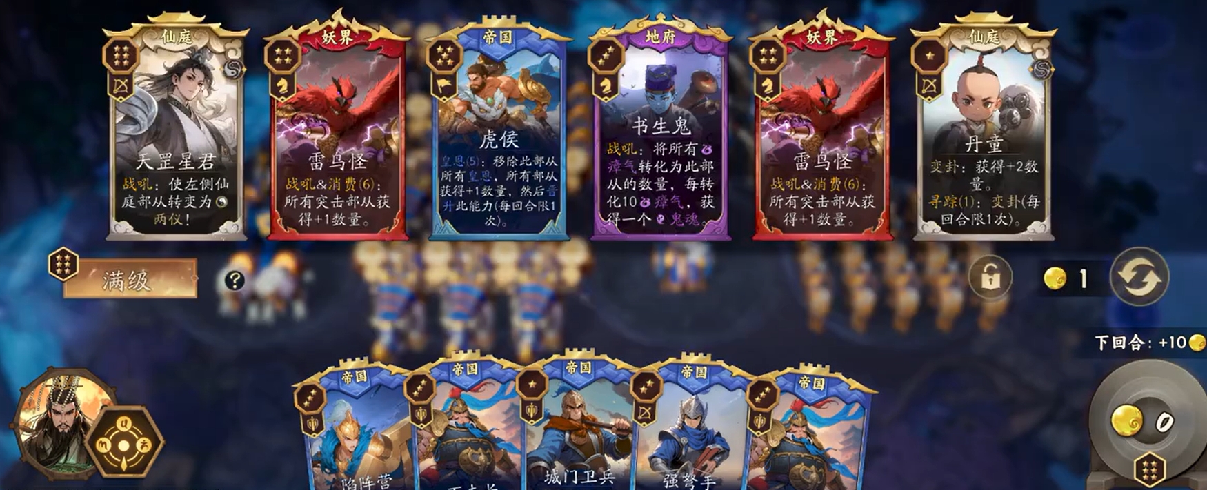在幻神选择上,始皇帝因其“打出皇恩牌时额外提供一点皇恩”的特性,能有效压缩虎侯启动门槛,是本流派的理想核心。其余帝国部从可灵活配置:如白马义从、南蛮骑兵、虎豹骑、长戟兵等具备“皇恩数量→部从数量”转化机制的单位;亦可搭配陷阵营等具备主动施加皇恩能力的支援型部从。前期过渡推荐使用城门卫兵与神射手,二者兼具站场强度与资源缓冲能力,确保在关键卡牌到手前维持血线健康。