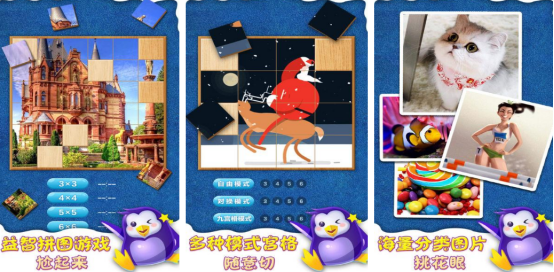 覆盖所有人群,就算是很多小孩子也可以随时随地畅玩,海量精美的图片应有尽有,就比如有美丽的风景或者是可爱的小动物等等,其中还有不同的游戏模式,就比如挑选自由模式之后,就会看到很多杂乱无章的小方块,而大家只要用手指拖动的方式放置在正确的位置上,就可以拼接成特别完整的图片。其次在九宫格模式中也传承华容道的拼图玩法,还有不同难度的等级应有尽有,比如44或者是66等。