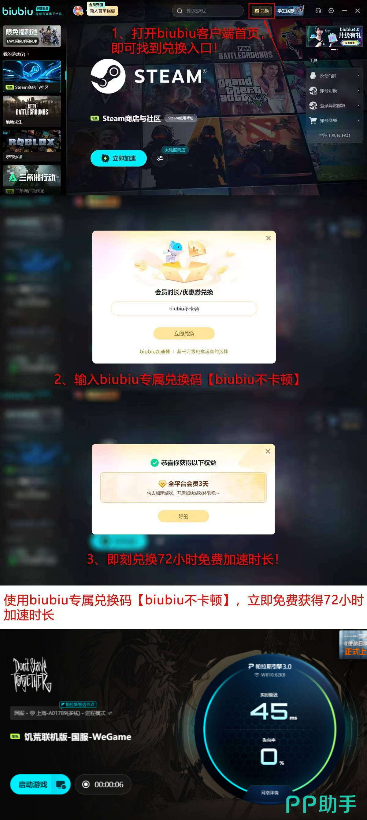 当前阶段新用户可享受限时加速权益:注册即赠全平台通用24小时免费加速时长;完成注册后输入激活码【biubiu不卡顿】,额外获得72小时连续加速服务,总计可享96小时无门槛网络优化支持。