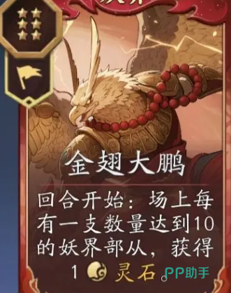 该体系的核心运转依赖三张关键卡:黄风怪、金翅大鹏与青毛狮王。黄风怪承担定向检索职能——其战吼效果可刷新天书并锁定妖族卡池,是前期稳定构筑的基础;建议开局保留一张用于持续搜寻体系卡,其余非核心卡及时替换以优化手牌资源。金翅大鹏提供可持续经济支撑,每回合开始时根据场上数量发放灵石,为中后期卡牌升级与阵容扩充奠定物质基础。青毛狮王则赋予全体友方单位战后触发能力,是提升整体技能覆盖率与连锁反应强度的核心枢纽,在阵容成长路径中具备不可替代性。