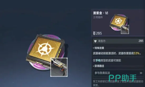 进阶阶段建议装配“黑索金”组件,该配置专为手枪类武器设计,激活后可直接触发被动增伤效果,全伤害提升幅度达53%。此为当前版本手枪输出上限的关键突破点,适用于追求极限压制力与高效率终结的进阶玩家。