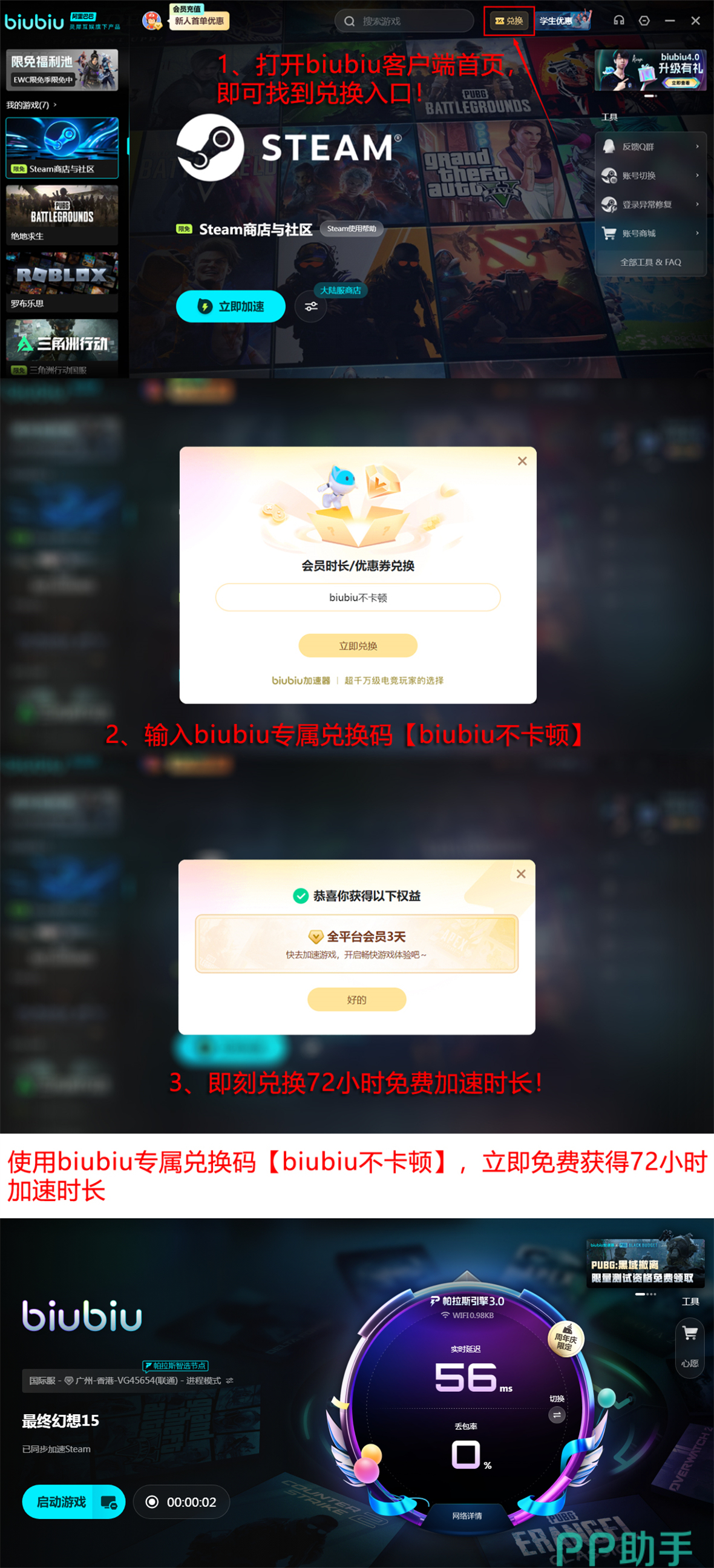 现在biubiu还支持免费试用,主要通过两项福利来实现,第一项是新注册一个账号,能立即获得24小时免费加速时长,每个新号都是如此。还可以通过输入兑换码【biubiu不卡顿】,兑换得到72小时加速时间,每个号都可以兑换一次。
