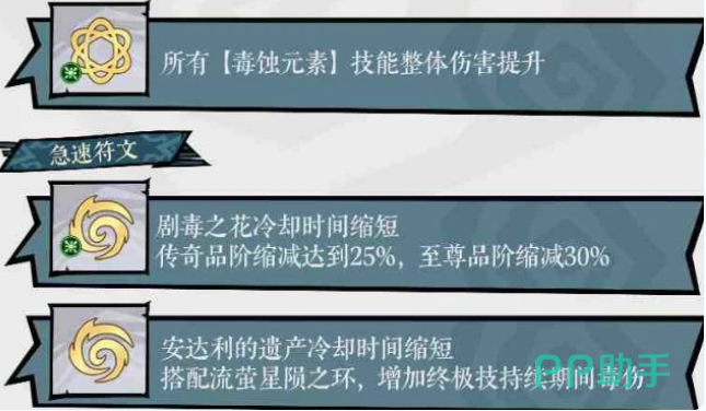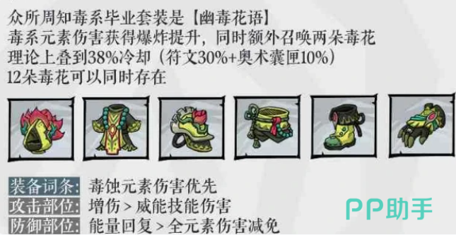 毕业套装推荐“幽毒花语”,该套装不仅提供全流派最高的毒性伤害增幅,更额外赋予+2朵毒花的召唤上限。配合其他词条与符文,最终可实现场上常驻12朵毒花的规模,极大拓展AOE覆盖半径与毒素覆盖率。若需进一步压缩冷却,该套装还可叠加约38%冷却缩减;配合符文系统提供的30%冷却缩减及大招强化效果,整体循环效率大幅提升。