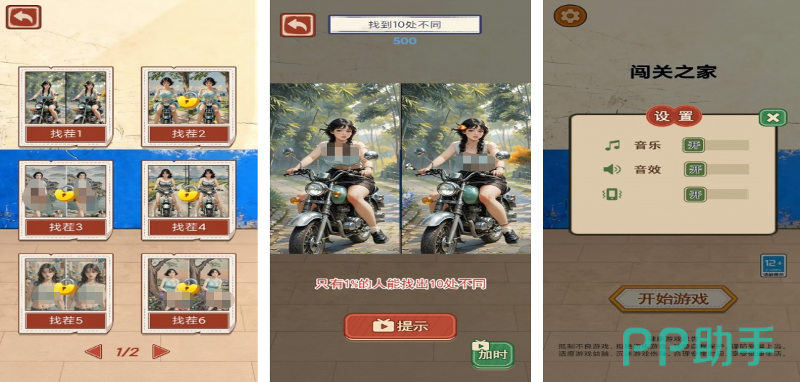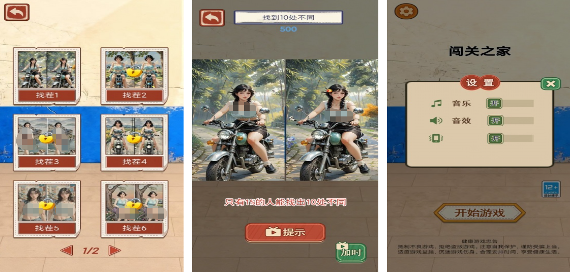 这一款游戏更类似于以往的找茬游戏,游戏中会给这两张极为相似的图片,而在规定的时间中,玩家们需要对这两张相似的图片找出它们的差异,游戏难度不高,是一个非常解压又非常益智的游戏,而游戏官方将会给上两张精美的插图,玩家们不仅可以欣赏图片,还能够感受到细腻的环境和人物形态,而玩家的主要目标就是找出十处差异,在有限时间之内找到之后,玩家们就能获得胜利。