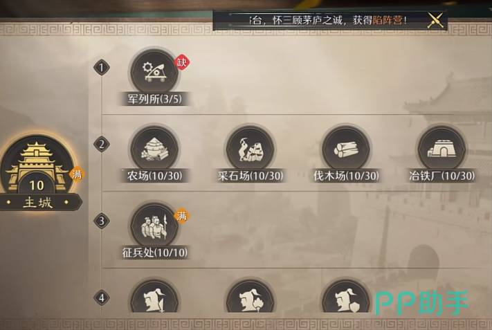 一般刚开始修建的都是主城区,随着资源的获取,可以建造兵营或者是其他的矿场,这时候矿场会获取大量的石料和铁矿,有了稳定的资源之后就能生成各类兵器,盔甲,初级状态下建造的城池防御力比较弱,如果有其他的成员进攻,很容易轻而易举的就被攻下,玩家需要多去消耗木材和铜钱,去升级这些城池的等级,这样就能抵御更多伤害,有了基础建筑之后,玩家就需要在科技树中做出相关的研究,这样能提升这些物资的获取速度。