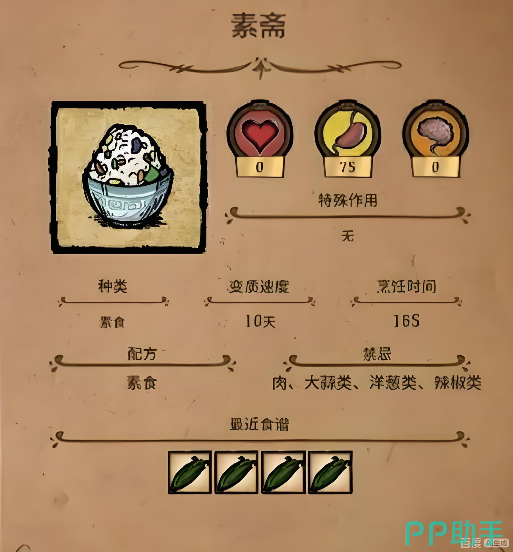 杂七杂八系列食谱常见推荐:蔬菜沙拉(+25饥饿/+15生命)、黄瓜沙拉(+20饥饿/+10理智)、西洋菜汤(+30饥饿/+20生命)、小猫零食(+15饥饿)、大猫零食(+25饥饿)、无花果汁(+20饥饿/+15理智)、椰子水(+20饥饿/+10理智)、幸运饼干(+15饥饿/+15理智)。