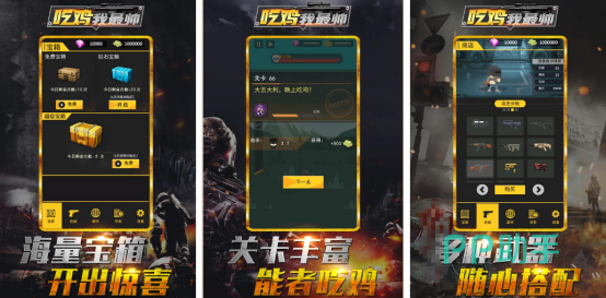 经典吃鸡玩法,还采用3d的高清画面所展现,不同关卡中所营造出来的敌人类型都是随机的,而在闯关时,只要将其中的敌人全部击败之后就可获得胜利,提供的武器类型也特别丰富,包括手枪或者是狙击枪等等,可从多种武器当中随心搭配。精准瞄准之后就可实现一键爆头。