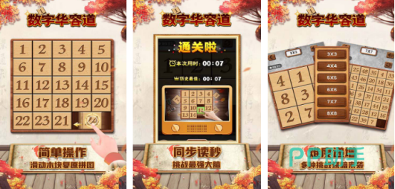 木质棋盘格组合而成,还分为多个不同难度的等级,从简单再到大师应有尽有,对于所有年龄段的人群来说都可轻松畅玩,就比如在简单的难度中将会看到九宫格,其中会有一到八的数字随机被打乱顺序,大家通过上下左右滑动屏幕的方式,将这些数字按照正确的顺序排列下来,就能顺利闯关,但是随着关卡的难度升级之后,挑战也越来越高,非常锻炼大家的大脑。