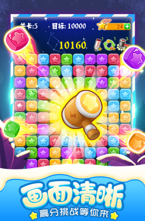 点击同色星星就能消除,规则非常简单。星星连萌与俄罗斯方块一起结合,摆满一行或一列就能够消除,这里面还有拯救萌星的关卡,里面有多种障碍元素。萌星解谜会将星星摆成各种造型,虽然可爱但消除要动脑筋,连消星星则需要通过滑动同色块相连接。游戏会限制你的步数,让你增加紧张度。