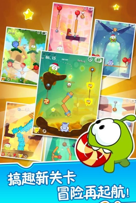 用手指划断绳子让糖果掉进Om Nom嘴里,还要收集星星。新增五个小伙伴,它们都有自己的本事,Roto可以飞行,把Om Nom带到最佳位置。场景从森林到沙漠、城市公园,超过300个关卡,关卡还有秘密关卡和额外挑战。物理反馈做得真实,糖果撞击、弹簧反弹都要算好时机。部分关卡有奖牌模式,比如不收集星星也能通关,增加了耐玩度。卡通画面可爱,背景音乐轻快。