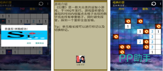 具有传统的扫雷模式,以逻辑推理为主要核心,通过点击方格的方式来揭开区域,数字提示周围地雷数量,目标就是在不触碰雷区的情况下,标注众多地雷,清除安全区,游戏中的部分版本都采用别致的无猜算法,确保每个关卡都有不同的特色模式,提供纯粹的解谜体验,游戏针对于触屏操作,支持多点触控与缩放模式,横竖屏自由切换,部分又优化了手势操作,全面增强信息识别效率。